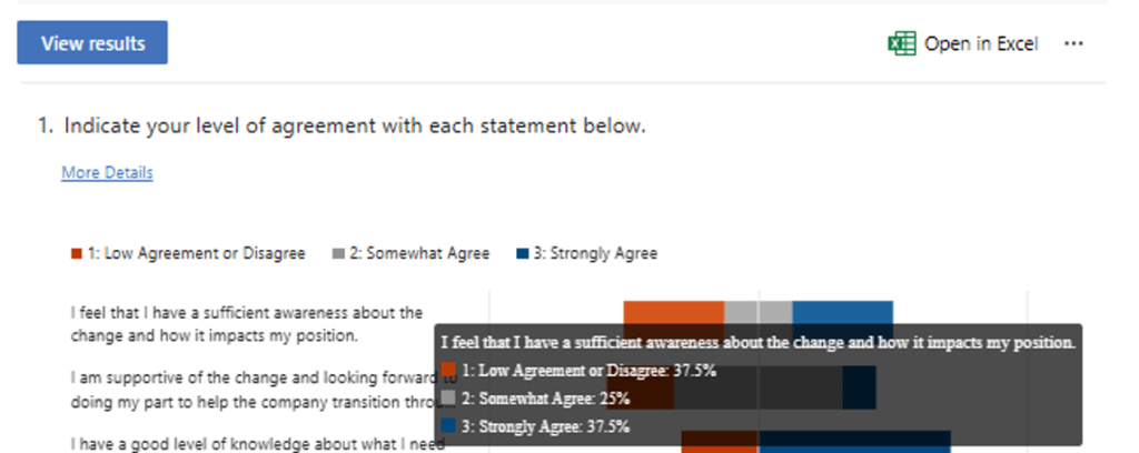 Change management is a growing focus of many organizations. This is due to the speed of technology-driven transitions. You can use Forms to improve user readiness for change adoption. Create and send out a change readiness survey to affected groups.